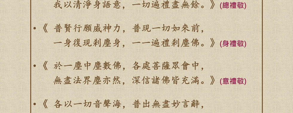 我以廣大勝解心,深信一切三世佛,悉以普賢行願力,普遍供養諸如來。(供養支—無上供)